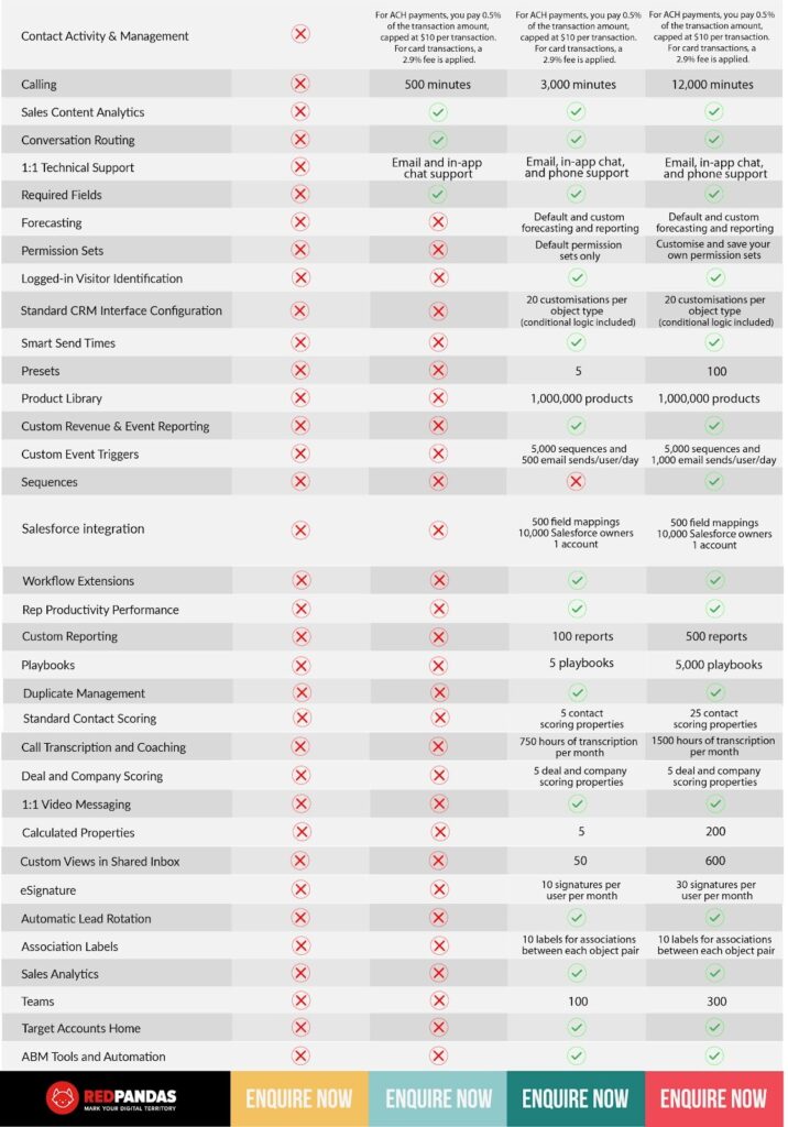 The Sales Hub can be used to manage and execute all sales activities. Below you can see the differences between each Sales Hub Plan: