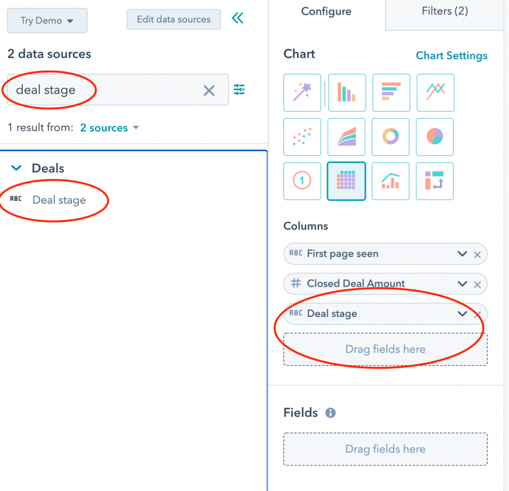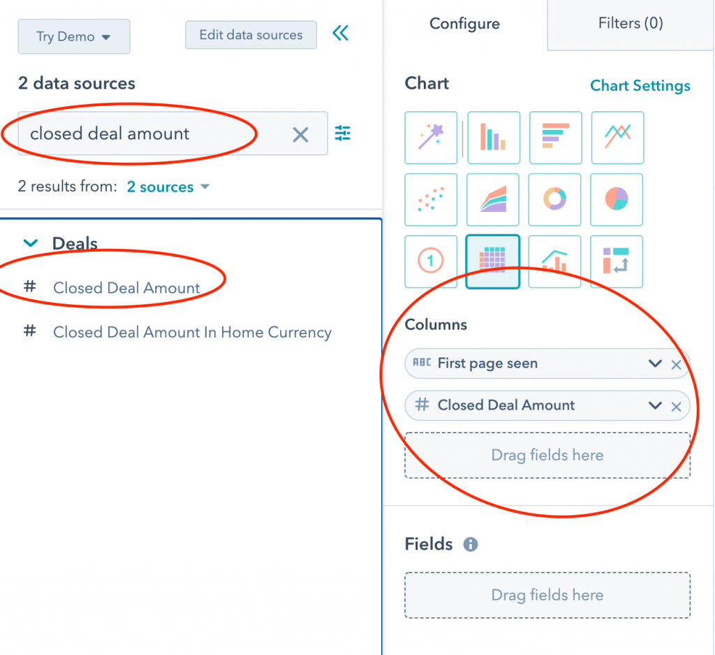 6. Look for “Closed Deal Amount” and drag that into columns.