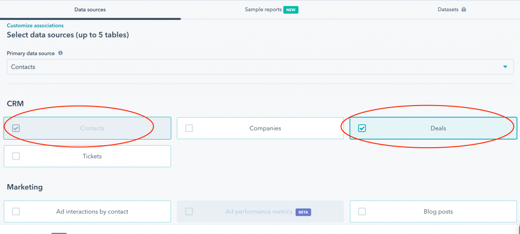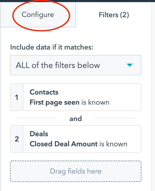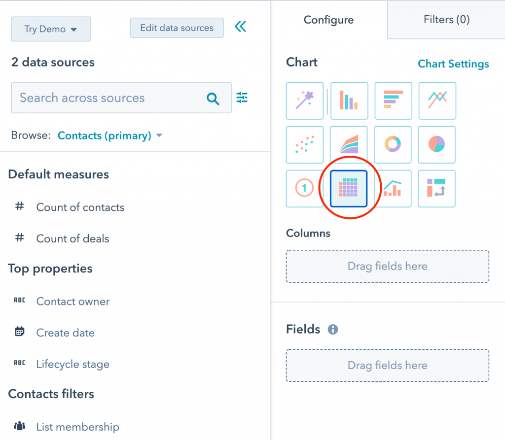 If you don’t record revenue in HubSpot you can follow all of the above steps but instead of using “closed deal amount” from step 6, we want to instead drag in “count of contacts” and “count of deals” in the column section. After this, you should follow the rest of the steps as presented above.