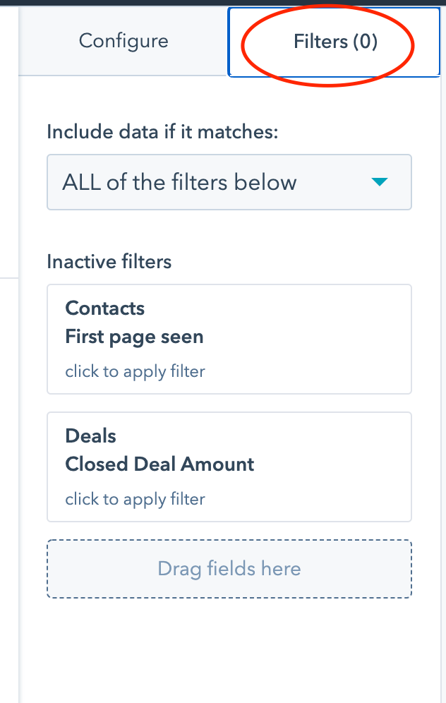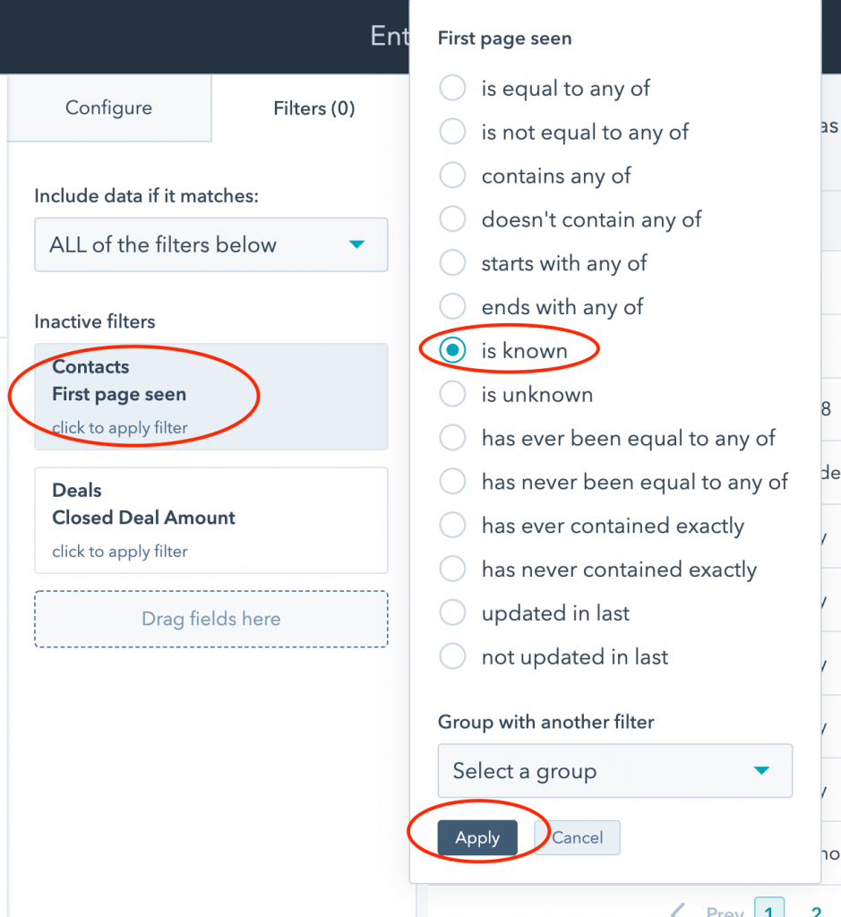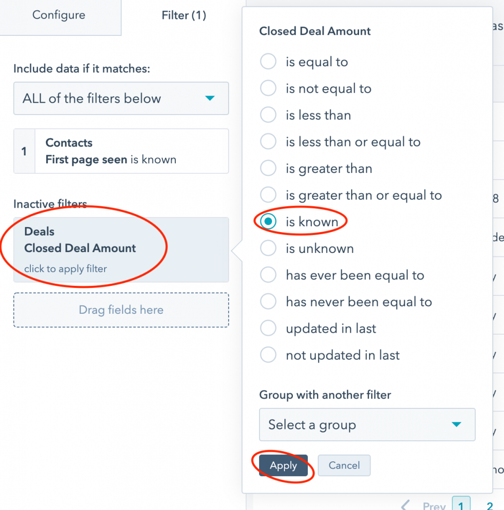 9. Before you hit save, here’s the important part – add “Deal stage” to your filter and add in all the deal stages that mean closed won for your business.
