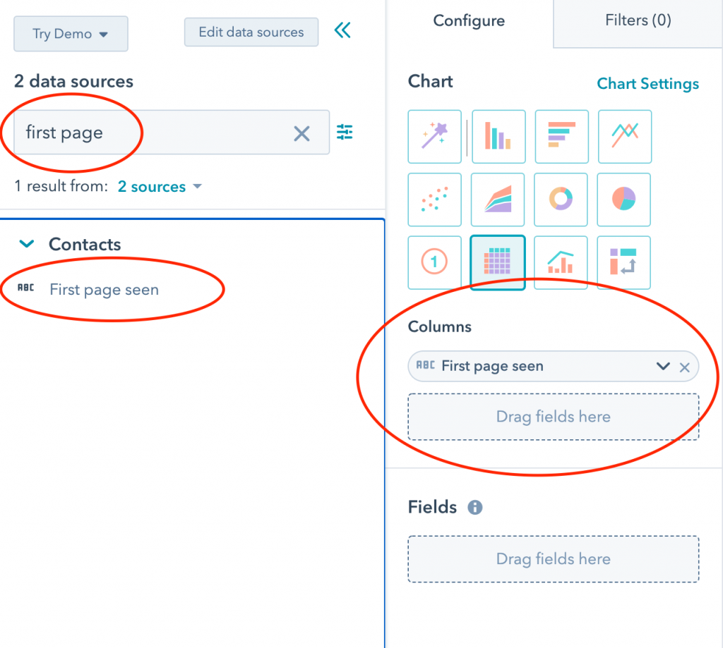 5. In the left data sources search field, look for “First page seen” and drag that into the columns section. Don’t worry too much if the data looks weird and doesn’t make too much sense at this point.