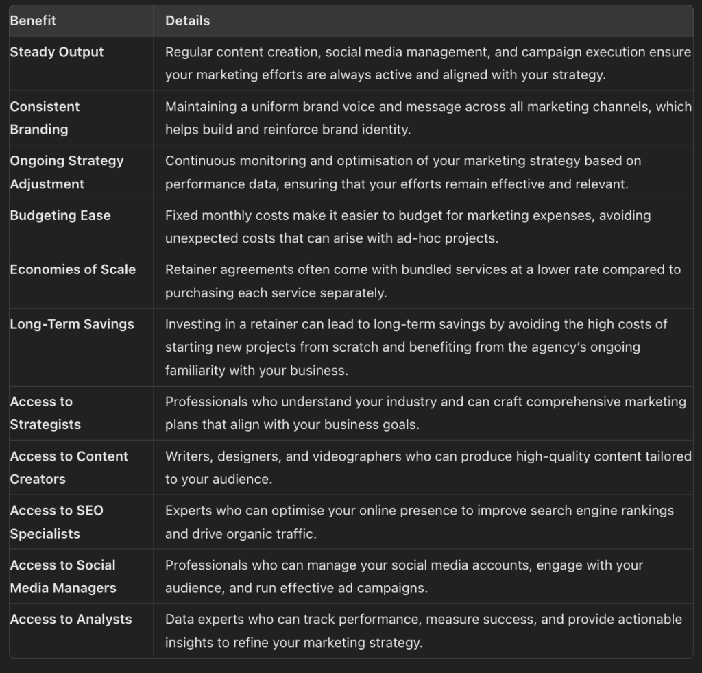 All in all, a marketing retainer offers a holistic approach to marketing, providing businesses with a steady stream of expert support and resources. This stability can lead to more consistent results and a stronger overall marketing presence.