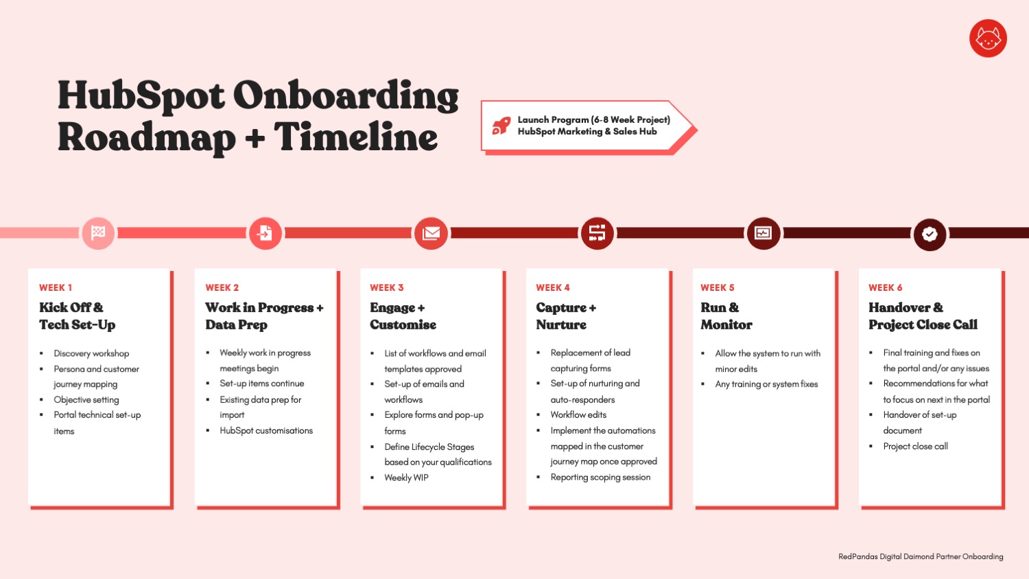 Your HubSpot onboarding & set-up takes about 6-8 weeks in total. This covers the discovery, hands-on implementation and onsite training components of your onboarding.